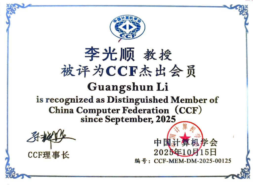 近日,在2025年度中国计算机学会(CCF)会员评选中,计算机学院院长李光顺教授荣获中国计算机学会(CCF)杰出会员(Distinguished Member)称号。