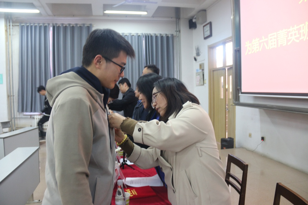 接着,孙旭春为英语四六级取得优秀成绩的同学颁奖,与会老师为第六届菁英班优秀学员佩戴徽章,勉励他们勇于承担时代赋予的使命,深化探索,追求卓越,希望他们在今后的学习中展现出坚韧不拔的毅力和积极进取的态度,作为榜样激励更多学生追求卓越。